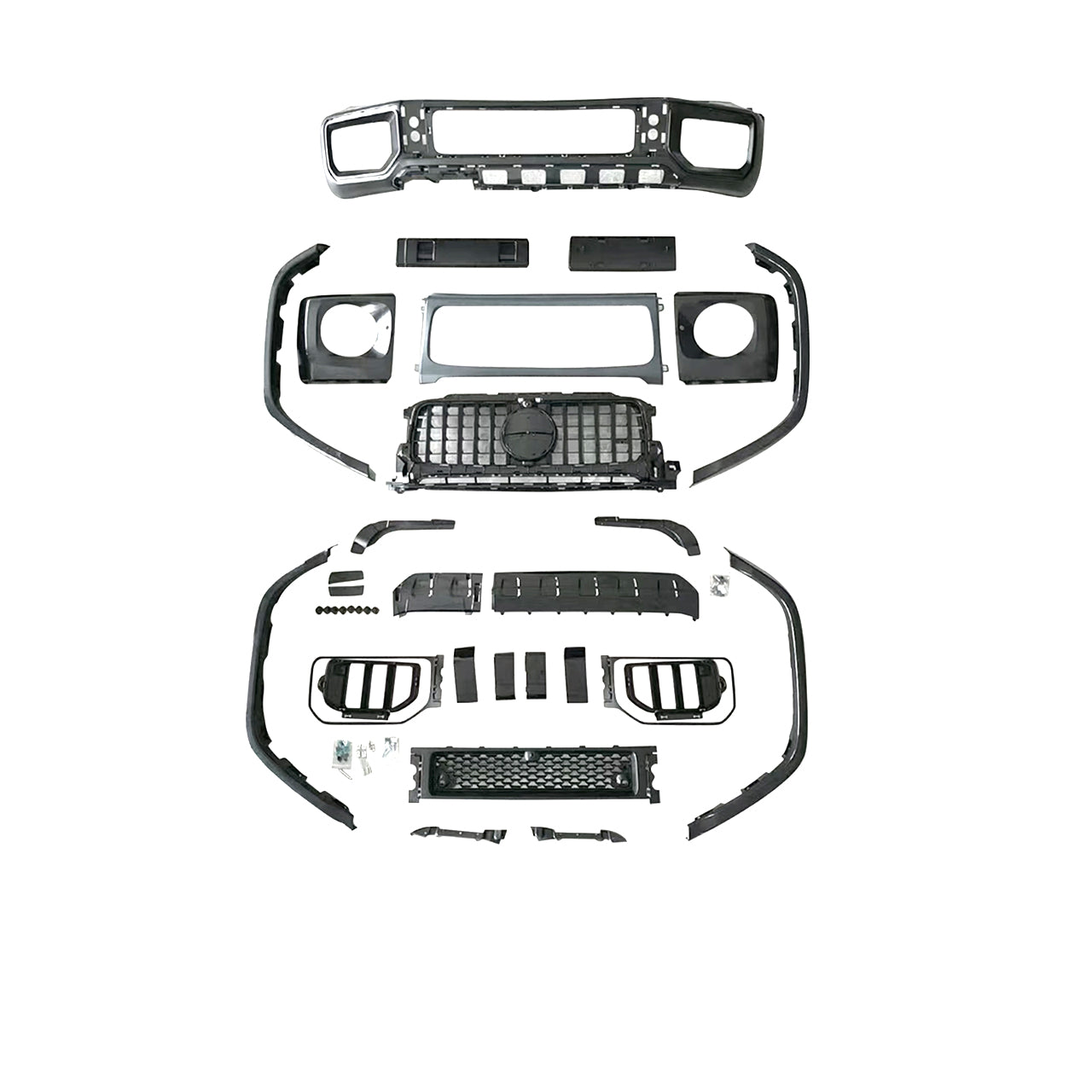 Upgrade your older G-Class to the latest G63 style. Includes bumpers, headlights, hood, fender flares, grille, taillights, and side mirrors. Made from high-quality materials for durability and easy installation.